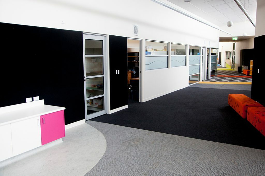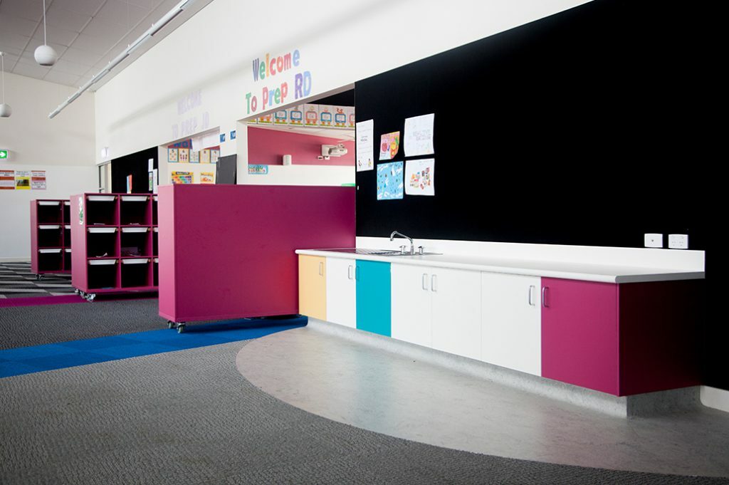 The construction of 3 new buildings at Tarneit Central College saw the inclusion of an Early Years Centre, Gymnasium and Administration/Classroom facility. Dezign was responsible for the manufacture, supply and installation of a great diversity of joinery items including two cohesive reception counters, staff and classroom kitchen joinery, bathroom vanity units, storeroom and associated administration storage facilities and a series of colourful classroom mobile storage units.